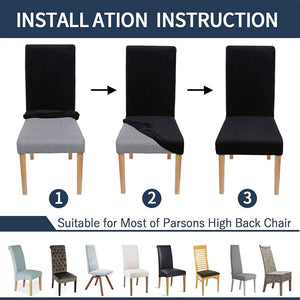 GREAT FIT: These slipcovers are one-size-fits-most. Suitable for normal and high back dining chairs. Fit chair back height: 19-28 inches; chair seat width and depth: 14-19 inches, thickness: 2-4 inches. Kindly measure before ordering. Flexible fit and easy to tuck, strapless and elasticized on the bottom so that it stays in place without shifting or moving