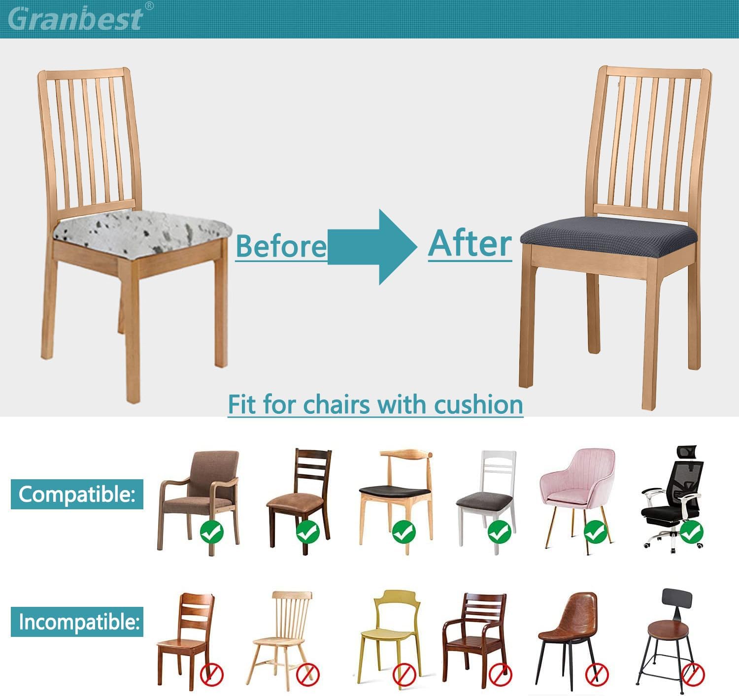 VARIOUS USAGE SCENARIOS:The chair seat covers of various colors can meet the needs of different styles and venues. Granbest chair seat covers are great for upholstered chairs in the kitchen, dining room, and more, a perfect decoration to renew your chairs and extend the life of the chair to save your money.