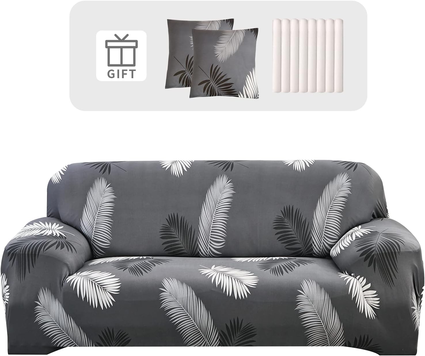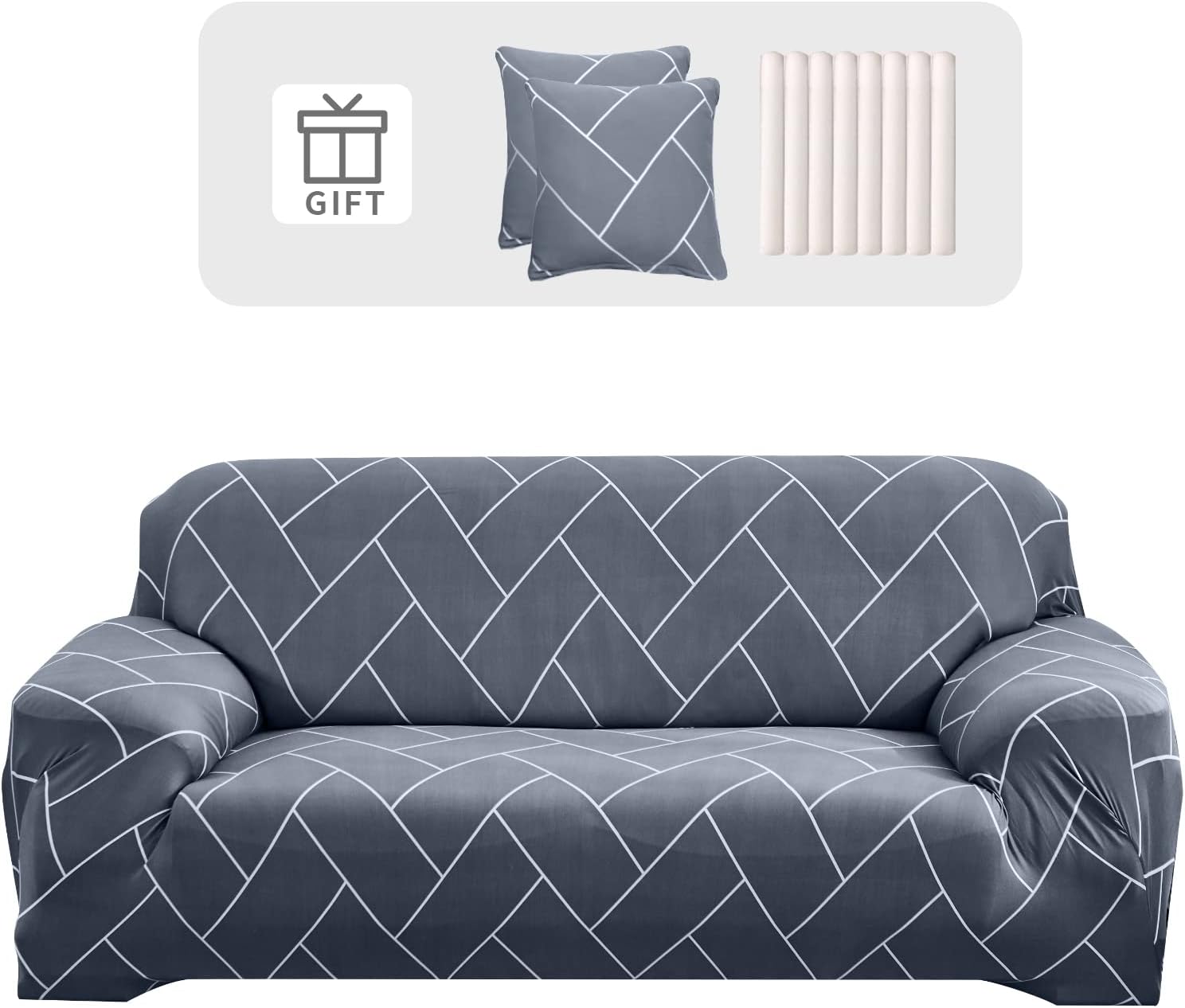 With Two Cushion Covers These sofa covers are compatible with most sofas. Always measures the size of the furniture before buying the sofa cover. 1 seat: 90-140 cm; 2 seats: 140-180 cm; 3 seats: 190-230 centimeter; 4 seats: 230-300 cm; Cushion Covers 45*45 cm. If you have doubts, select a larger size. If your sofa is a sectional sofa, buy more pieces.