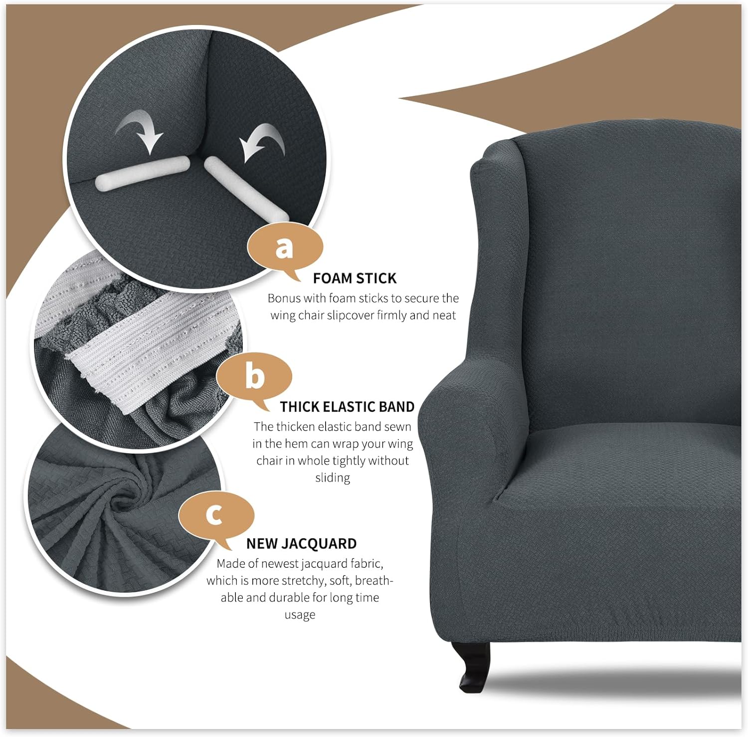 Transform your wingback chair with this Super Stretch Slipcover. Made of soft spandex jacquard fabric, it easily covers your chair and stays in place with included foam rods. Keep your chair looking like new and elevate the style of your living room with this wing chair cover.