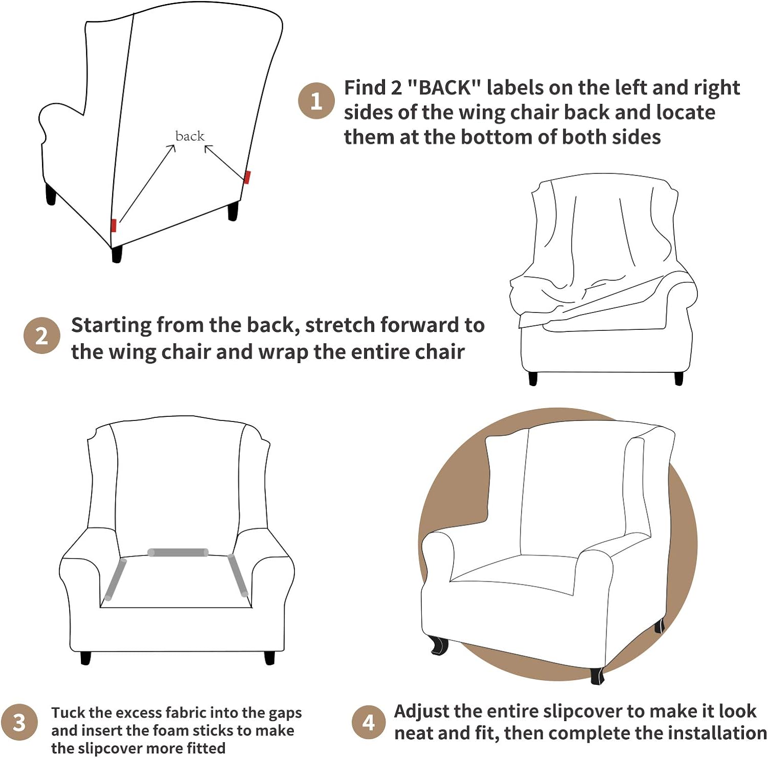 • PERFECT FIT: Due to the high elasticity fabric, slipcovers for wingback chairs are flexible enough to cover your chair easily and without changing its shape. Bonus with foam sticks which can be stuffed into the gap of the wingback chair slipcover to keep it tidy; 4 straps sewn at the bottom to be fixed around the chair legs can secure the wing chair cover stays firmly in place, our wing chair slipcover can give your wing chair perfect fit and without too much effort